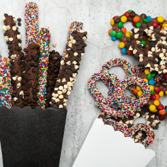 Feeling extra indulgent? Then opt for Nassau Candy’s Chocolate Covered Premiere Pretzels sprinkled with Mini M&M’S or Reese’s Pieces.