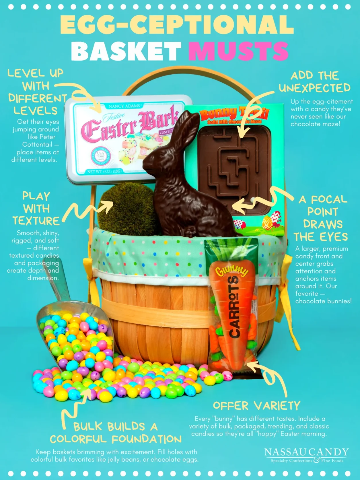 - Bulk Builds a Colorful Foundation – Keep baskets brimming with excitement. Fill the holes with colorful bulk favorites like jelly beans, or chocolate eggs.
