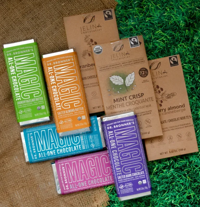 In this trend, the brand draws customers as much as the ingredients. A brand that’s new to the chocolate space but is recognized by customers for its sustainability is Dr. Bronner’s. Known for organic, Fair Trade, natural soaps, Dr. Bronner’s brings its ethical sourcing and expert craftsmanship to chocolate making. Their Magic All-One Chocolate bars feature the iconic vibrant colored packaging customers will instantly recognize, packed with exceptional flavors like Dark Chocolate Crunchy Hazelnut, Dark Chocolate Almond Butter, Salted Dark Chocolate and Dark Chocolate Smooth Coconut Praline.